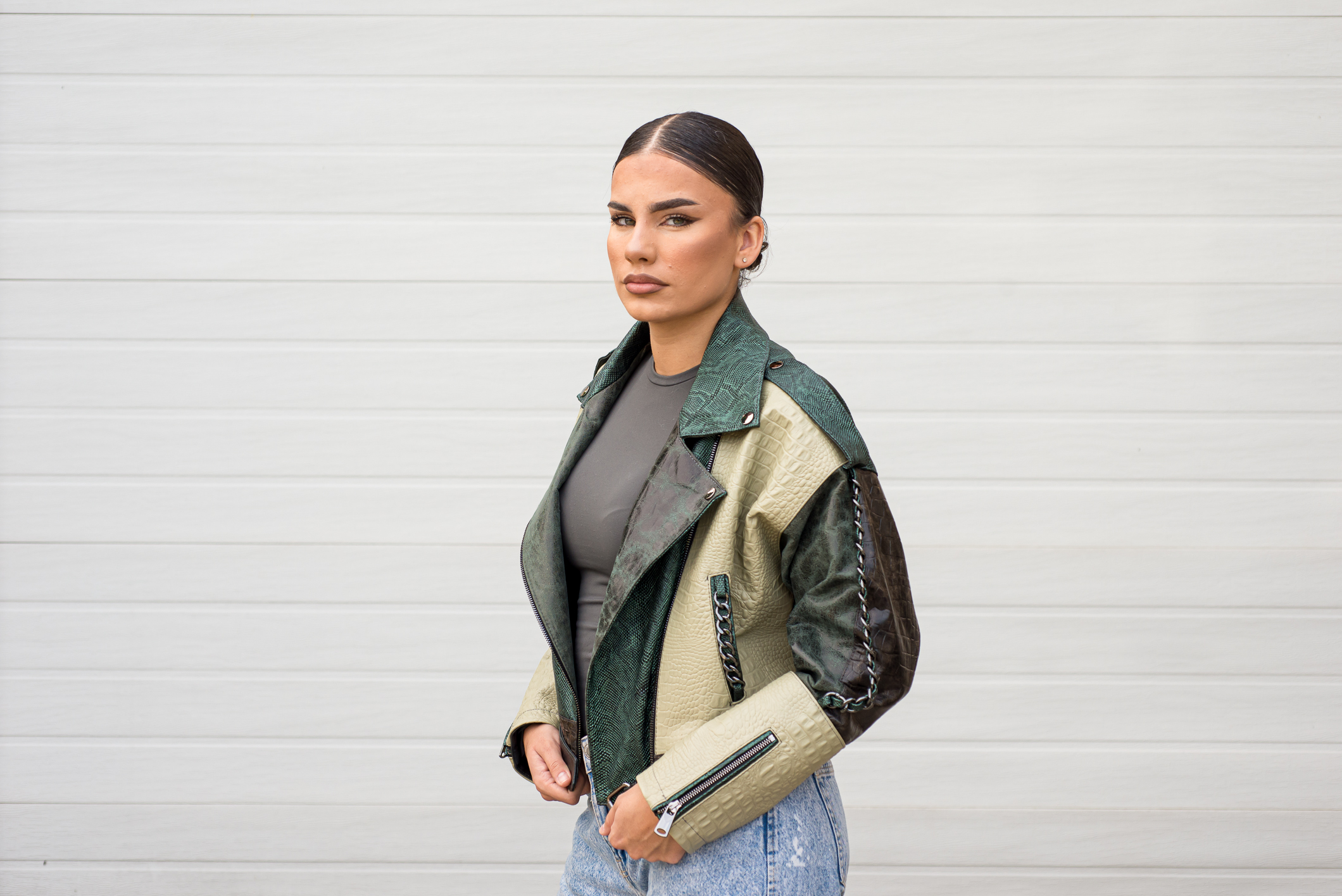 Kožna jakna modernog oversize kroja od mekane jagnjeće kože. Kragna na jakni je od prirodnog krzna lisice, može se skinuti i stavljati po potrebi. Model je unikatan.