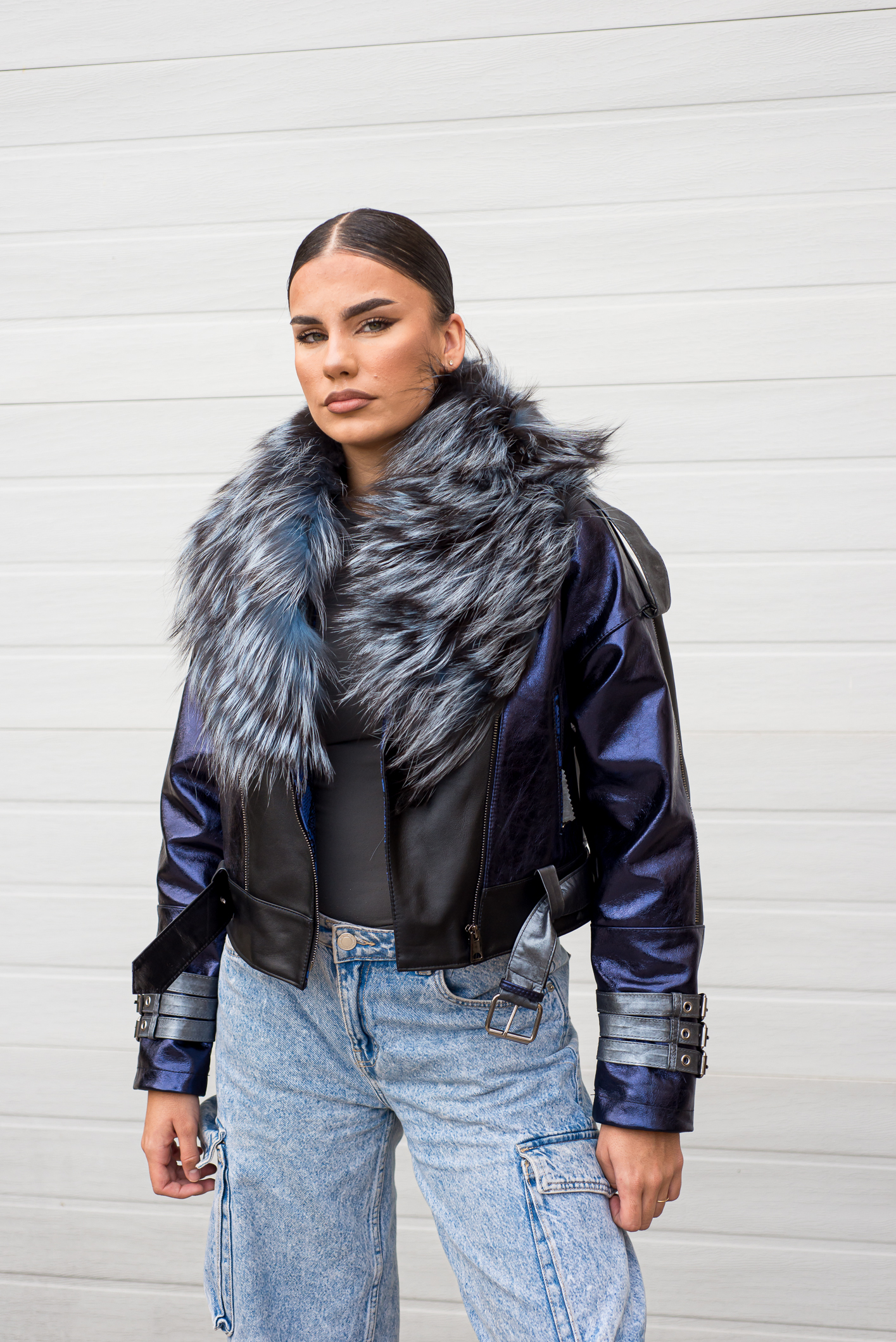 Kožna jakna modernog oversize kroja od mekane jagnjeće kože. Kragna na jakni je od prirodnog krzna lisice, može se skinuti i stavljati po potrebi. Model je unikatan.