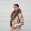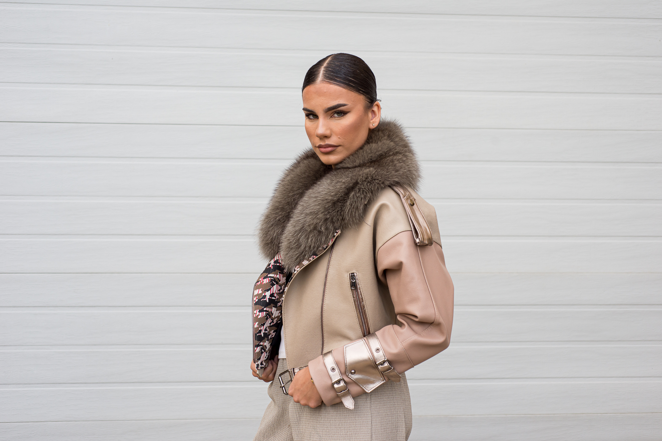 Kožna jakna modernog oversize kroja od mekane jagnjeće kože. Kragna na jakni je od prirodnog krzna lisice, može se skinuti i stavljati po potrebi. Model je unikatan.