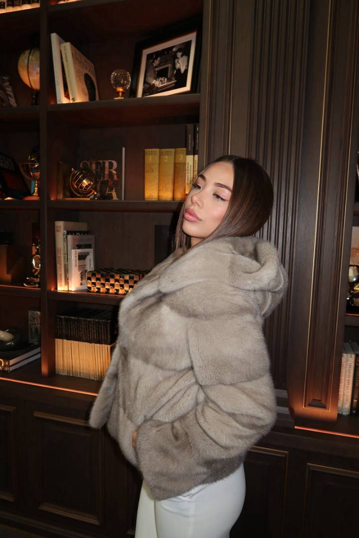 Ovaj elegantan model bunde izrađen je od najkvalitetnijeg prirodnog nerc krzna,model je sa kapuljačom,postoji mogućnost strukiranja.